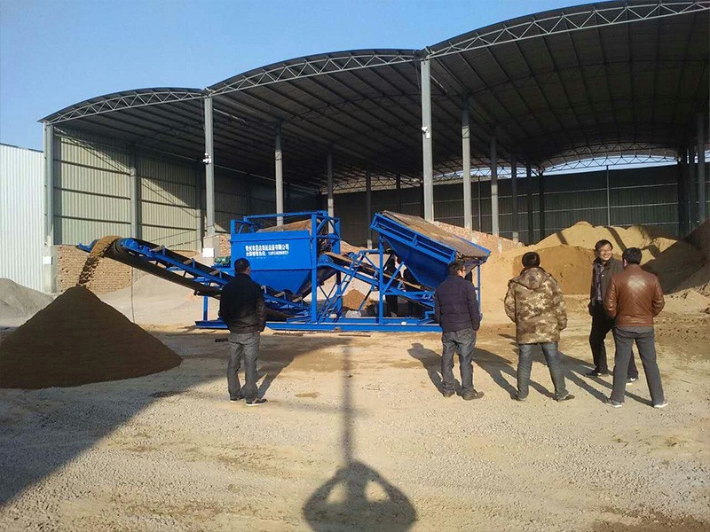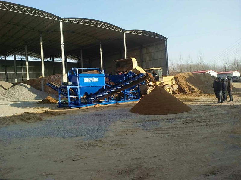 整個設備由原料儲料斗、原料供料皮帶機、平置篩網、成品砂堆料皮帶、棄石出料槽等組成,設備通電運轉后由裝載機將原料裝入大容量儲料斗,原料經由供料皮帶投入到平置篩筒,旋轉的篩筒帶動原料在筒內葉片的推擠、翻滾下形成原料在篩網面滑滾的人工篩砂效果,篩出的成品砂通過集料斗落在成品砂皮帶上,同時被皮帶提升落下呈成品料堆、或直接落入儲料斗,整個過程連續且物料分級清楚。